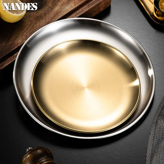 4Pcs Round Golden Plate Rust-Proof Stainless Steels Shallow Tray Plate 20/23/26/30cm Camping Plate BBQ Picnic Dishes Cookware